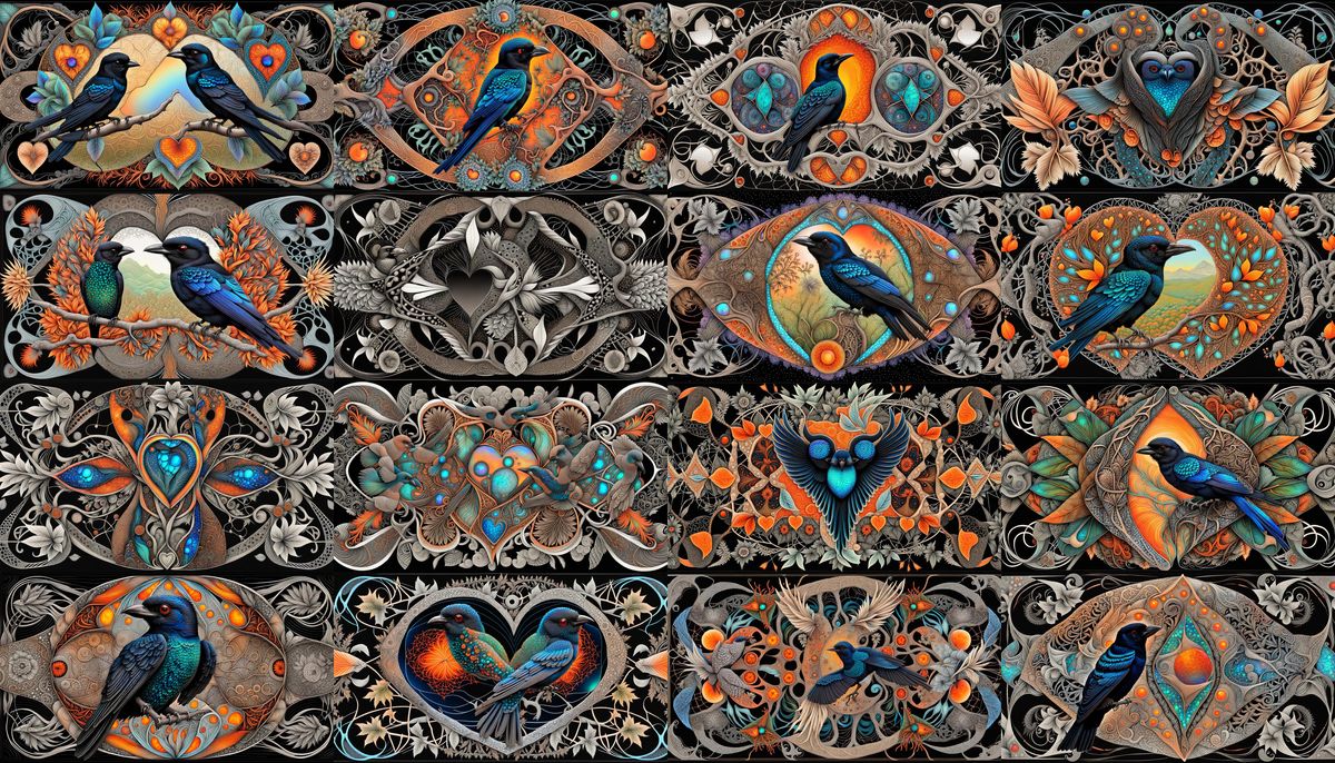 This image shows a spangled drongo bird surrounded by ornate, fractal-like foliage. The artwork features vibrant colors, intricate details, and a harmonious blend of natural and geometric elements.