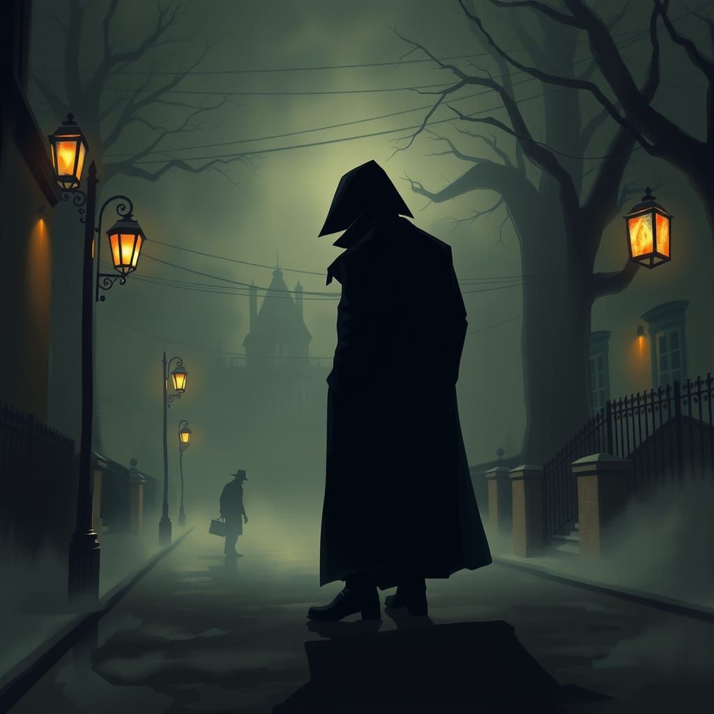 A shadowy figure stands on a foggy street beneath dim lanterns, with a mansion silhouette in the background. The image has a noir aesthetic with bold brushstrokes and a muted color palette.