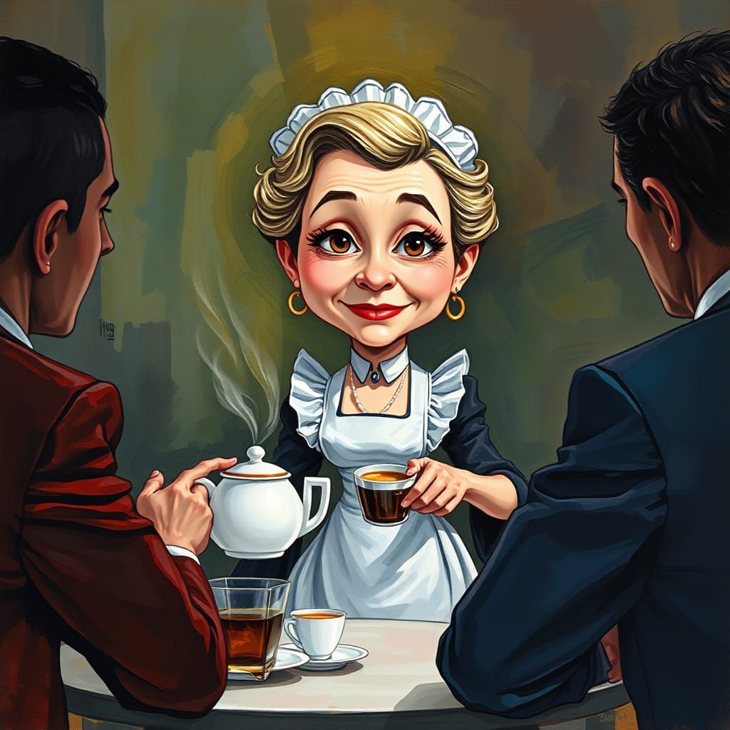 A gouache painting in an impressionist style depicting a caricature of the Italian leader serving coffee to shadowy figures. Features bold colors and textured brushwork.