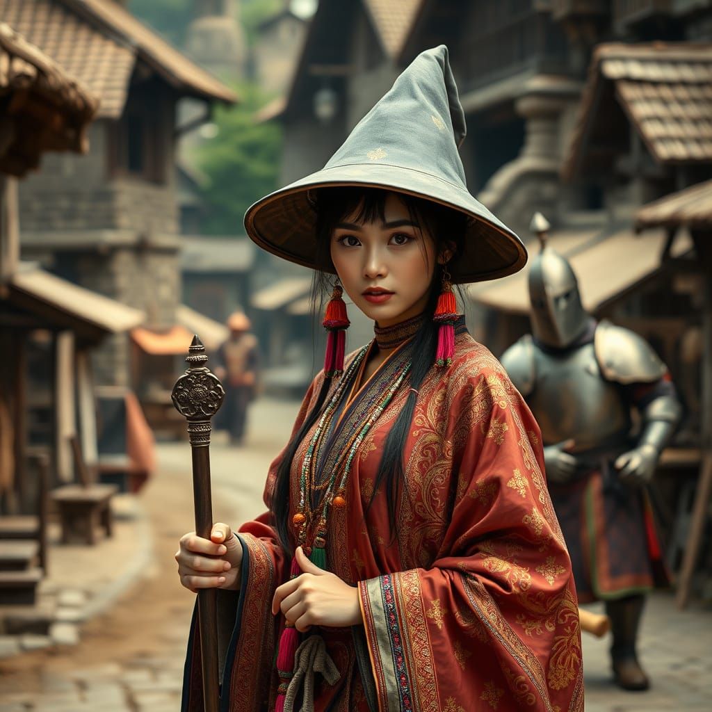 This captivating image depicts a confident Hmong female wizard casting a spell, surrounded by the bustle of a medieval town, with a stern guard entranced by her mystique, set against a warm, golden backdrop with cinematic lighting and subtle shadows.