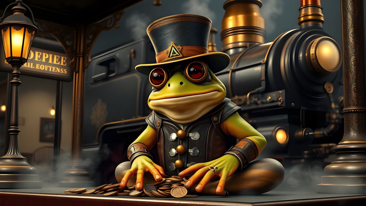 This image shows a Steampunk-inspired frog, reminiscent of the Victorian era, playing with coins at a classic bus stop.
