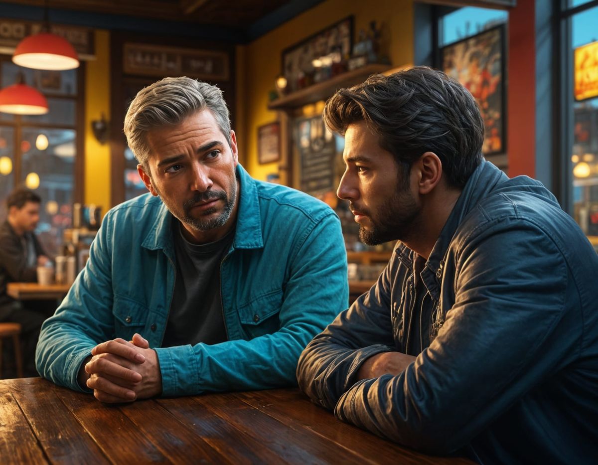 A friend listening to a man who looks very sad, looking at him with compassion, in a coffee shop, Hyperrealistic, splash art, concept art, mid shot, intricately detailed, color depth, dramatic, 2/3 face angle, side light, colorful background, sharp details, sharp focus, high resolution, realistic skin, ...
