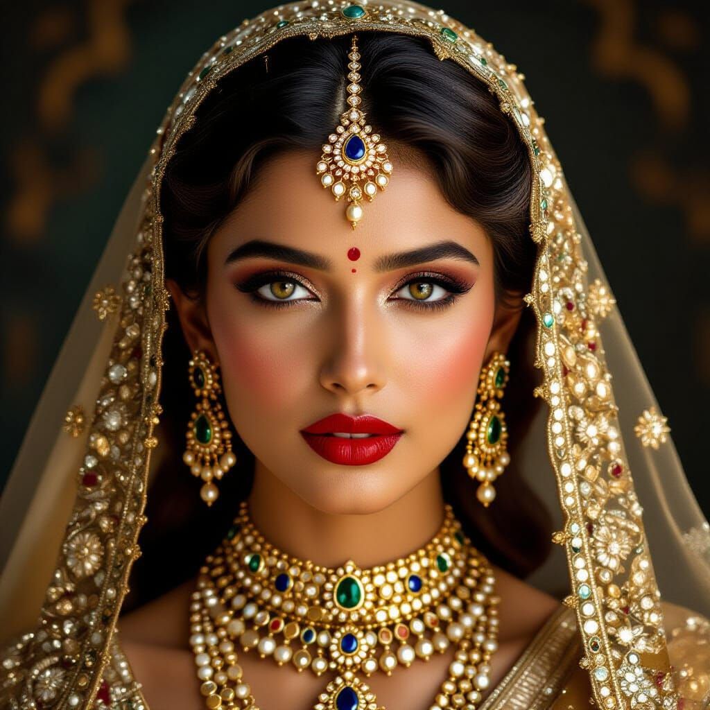 Experience the elegance of royal heritage with this hyper-realistic AI-generated portrait of an Indian princess. Adorned with a golden embroidered veil, a gemstone-studded tiara, and an intricate choker necklace, this artwork captures the timeless beauty of regal tradition. The photorealistic details, sapphire accents, and dramatic lighting create a powerful and luxurious masterpiece, perfect for lovers of historical, cultural, and fantasy-inspired digital art.