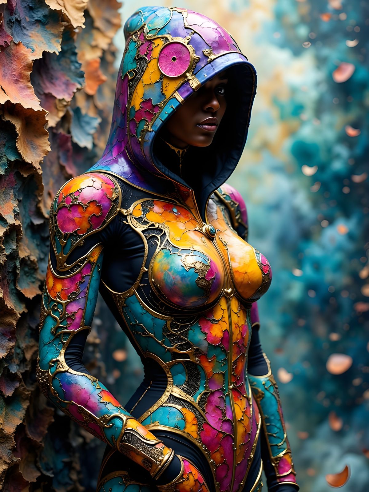 A maximalist digital painting of a woman wearing a hoodie. This image features intricate details, dramatic lighting and abstract fractal elements in an expressionist style with steampunk influences.