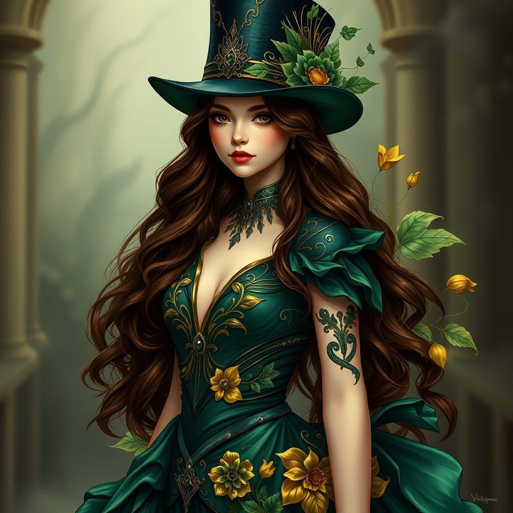 This digital painting showcases a woman in a dramatic emerald green evening dress with a top hat, blending Art Nouveau and futurism elements with flowing silks and gold accents.