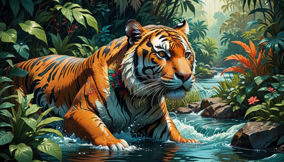 A striking picture of a tiger walking through a jungle river. The animal is surrounded by lush vegetation, accentuated by vibrant colours and dramatic lighting, in a splash art style with linocut elements.
