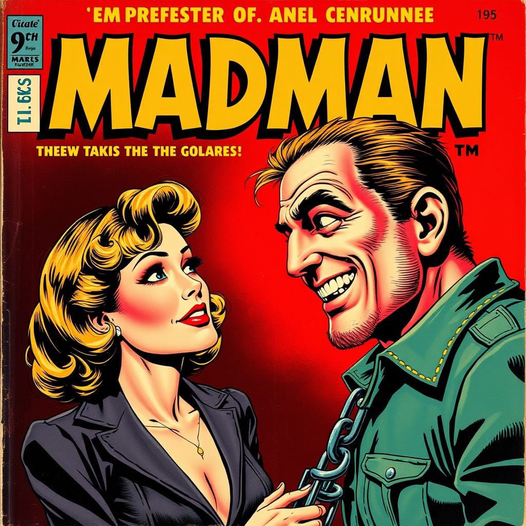 A vintage comic book cover featuring a female guard observing a chained villain who is smiling. The artwork is reminiscent of classic comic book art with smooth lines.
