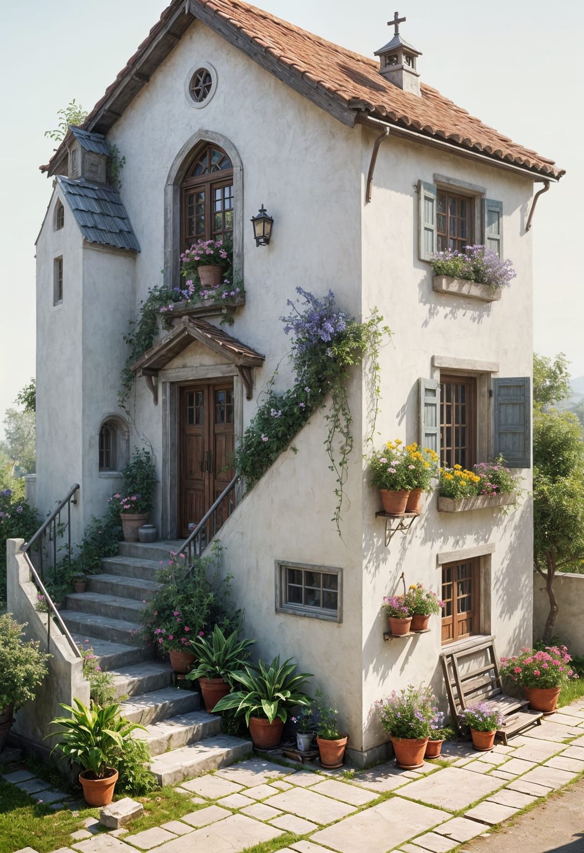 This image showcases a detailed origami village scene with a church, trees, and flowers. Created with intricate paper folds and deep, complementary colors, it features a soft focus and ultra-detailed elements.