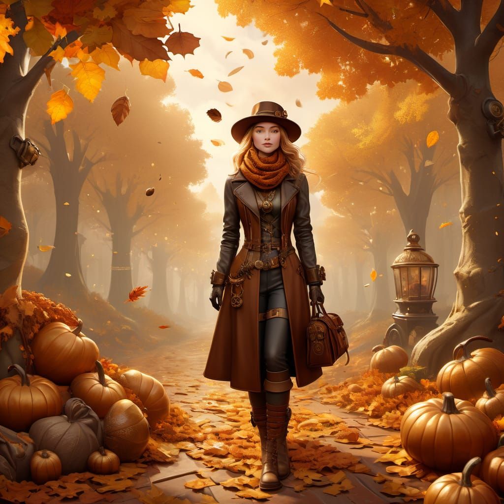 A stylish young woman in steampunk-inspired autumn fashion, with earthy colors and vintage accessories. Set against a background of gears and art nouveau patterns with golden hour lighting.