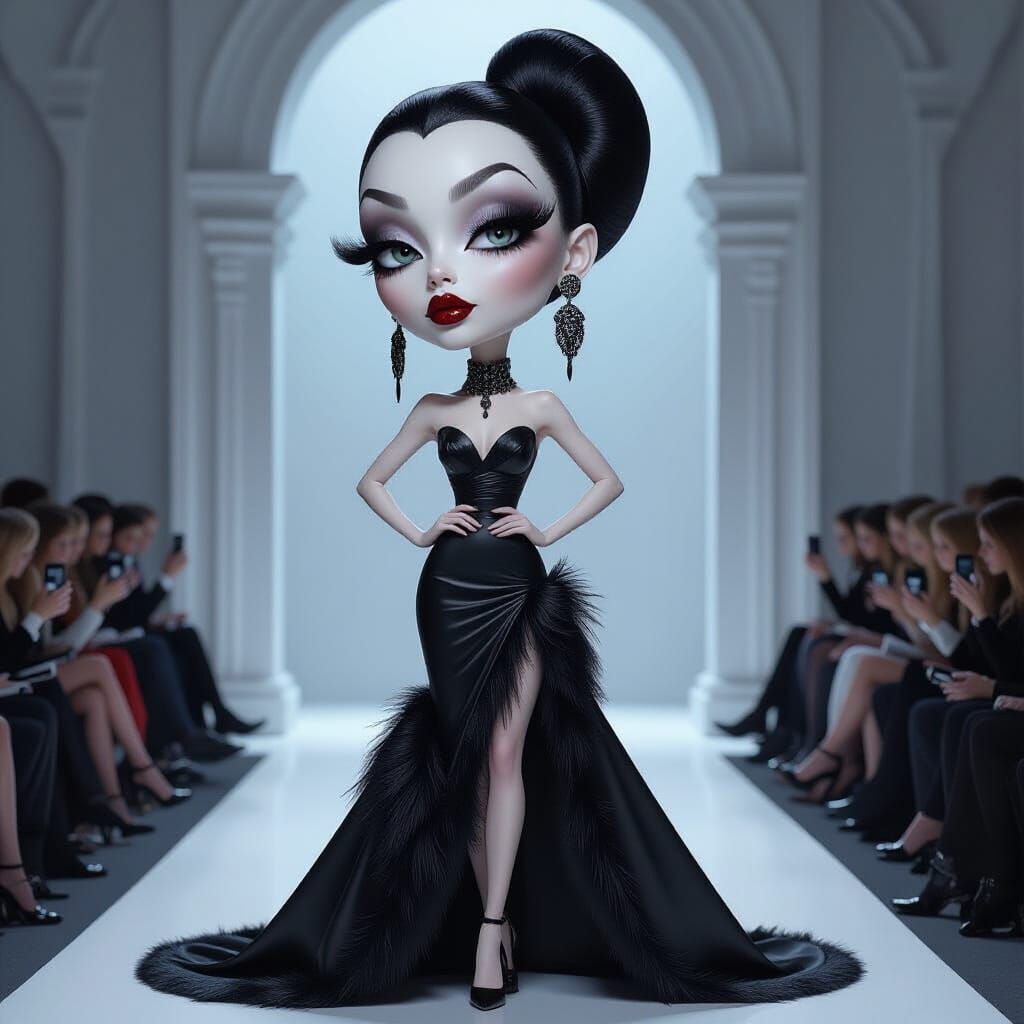 Photorealistic, surreal caricature of a female Gothic model, styled for a high-fashion magazine spread. Pale-skinned with enormous expressive eyes, elongated neck, tiny pointed nose, oversized head, angular slim frame. Elegant side profile, exuding aloof superiority. She wears an absurdly voluminous, ...