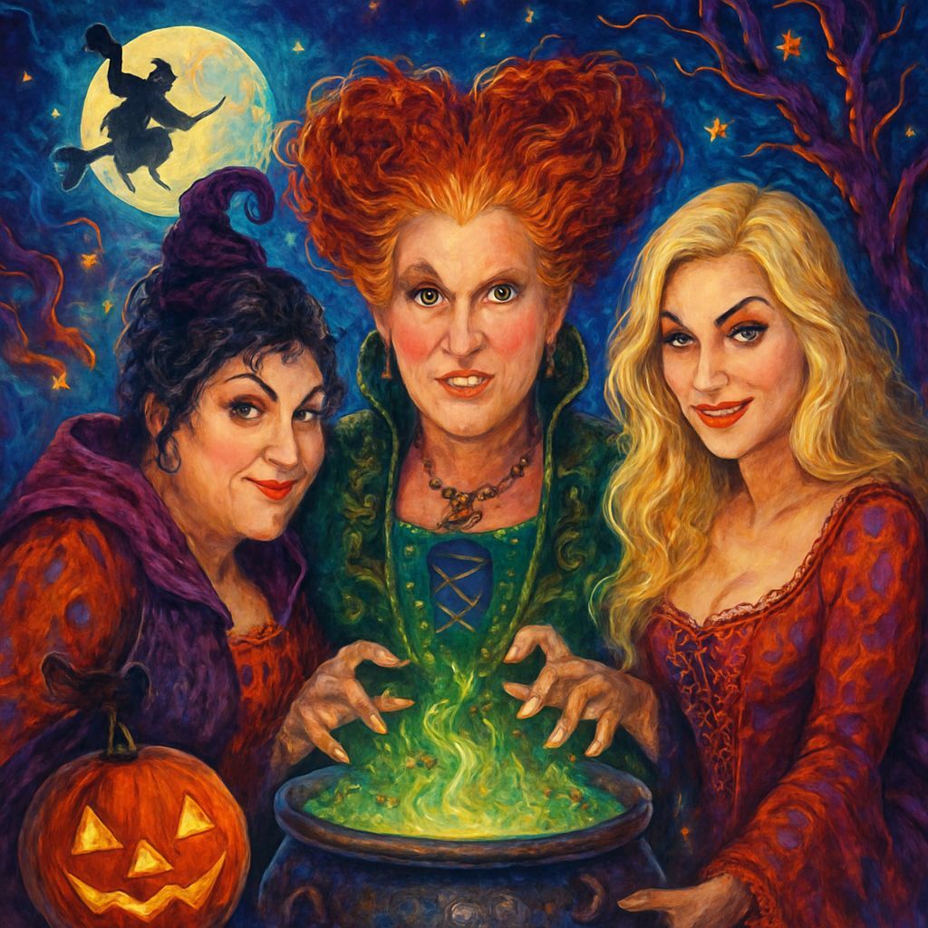 This vibrant and hyper-detailed artwork captures the whimsical spirit of the Sanderson Sisters from Hocus Pocus, featuring perfect lighting and a colorful aesthetic.