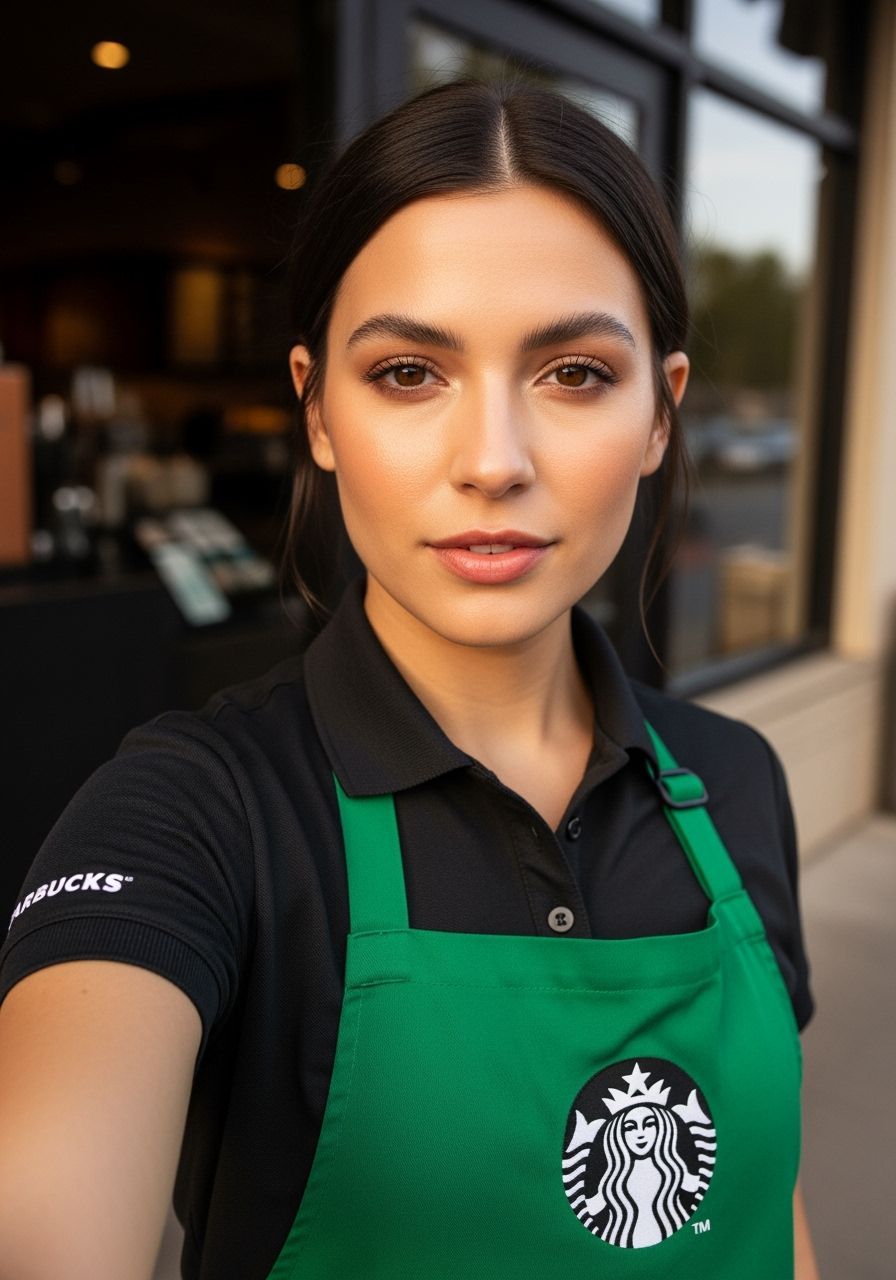 This image shows a Starbucks barista taking a selfie. She has brunette hair, natural makeup, and wears the iconic green Starbucks apron with a black polo shirt. The photo is bathed in soft, warm light.