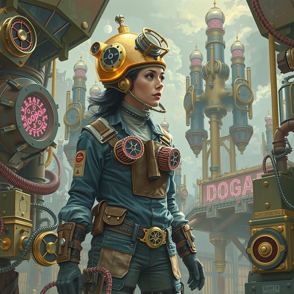 A striking image of a woman laborer in functional denim attire with brass accents, standing in a detailed steampunk city. The scene blends brutalist and lowbrow art styles with fantasy elements.
