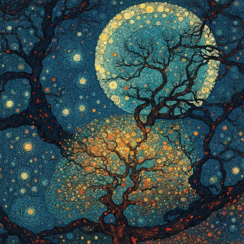 A captivating digital artwork featuring a Tree of Life in shimmering flat colors, surrounded by a dynamic, starry night sky with intricate details and vibrant hues, blending elements of Klimt and Van Gogh's styles with modern digital flair.