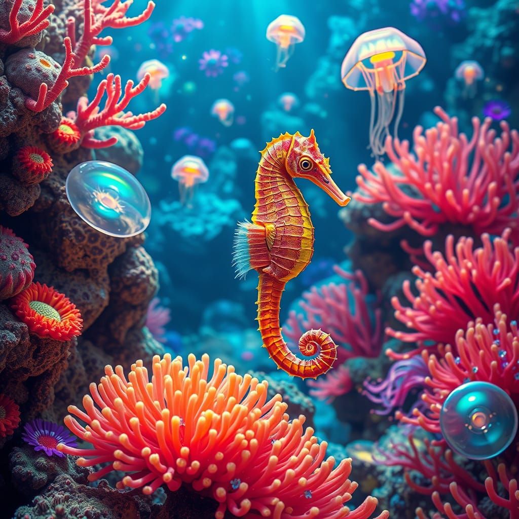 A vibrant seahorse swims through a psychedelic coral reef. Iridescent anemones and glowing jellyfish create a dreamy, futuristic, and surreal scene in a kaleidoscope of color.