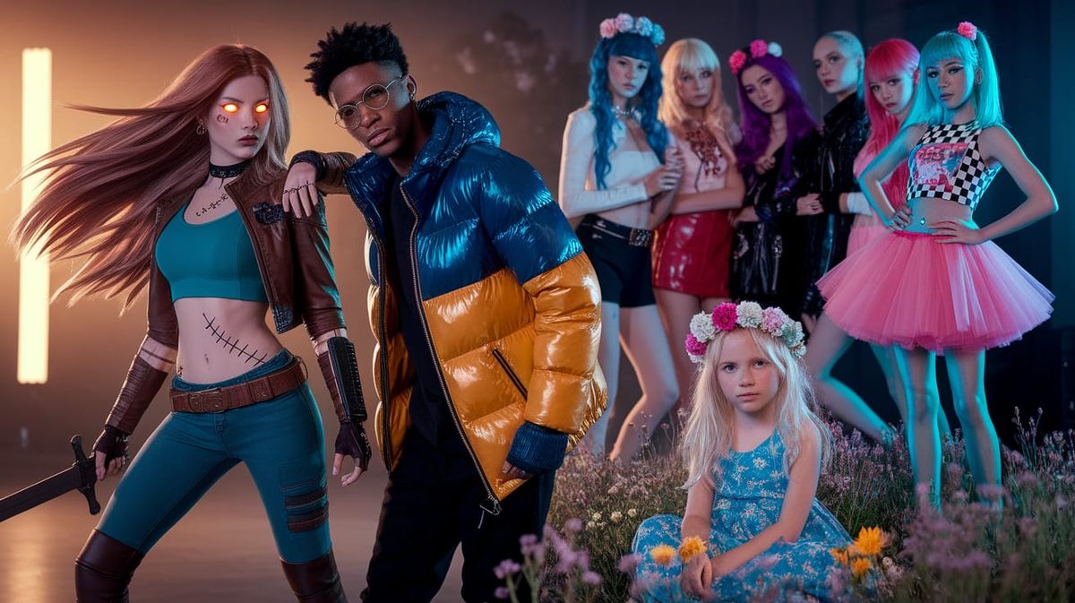 This image shows a dynamic gathering of friends from different worlds, featuring a stylized female warrior and a young man in futuristic streetwear, surrounded by a group of alt-punk girls and a mysterious hooded woman, set against a dreamy backdrop.