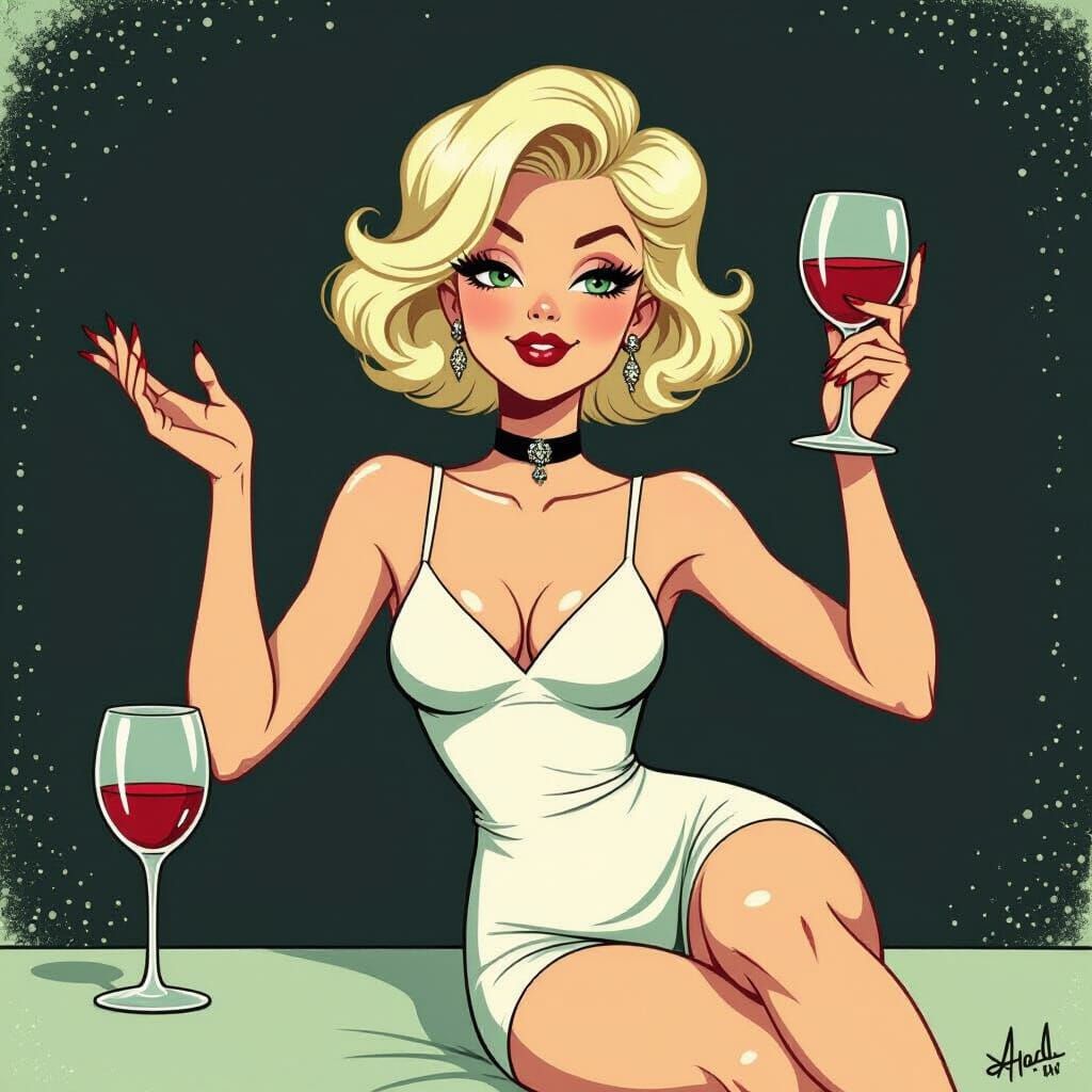 A platinum blonde goth girl in a white dress reclines with a wine glass, depicted in a vintage rubber hose animation style with a limited dark, white, and green palette.