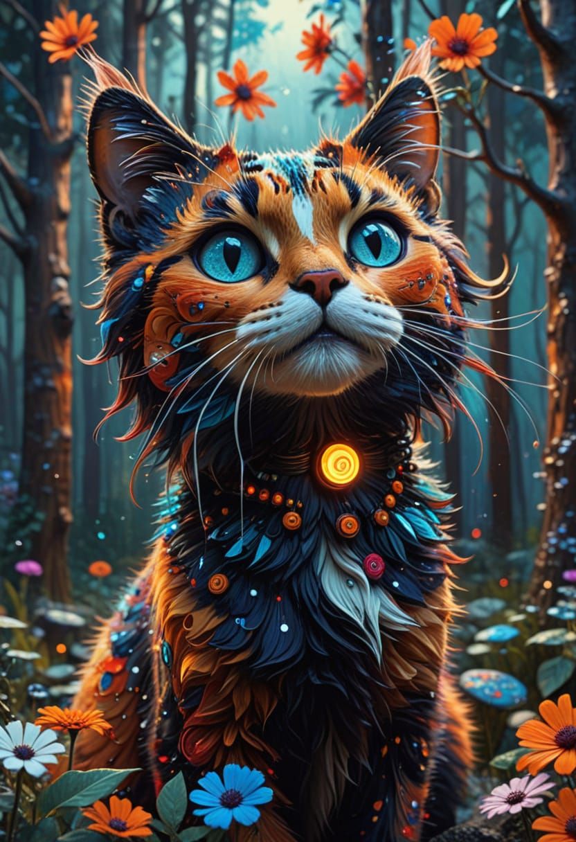 A close-up of a majestic cat with a long tail stands amidst a mystical forest, surrounded by vibrant flowers, wood, and rocks, in a kaleidoscope of colors, with intricate patterns and symbolic details, set against a dreamlike atmosphere