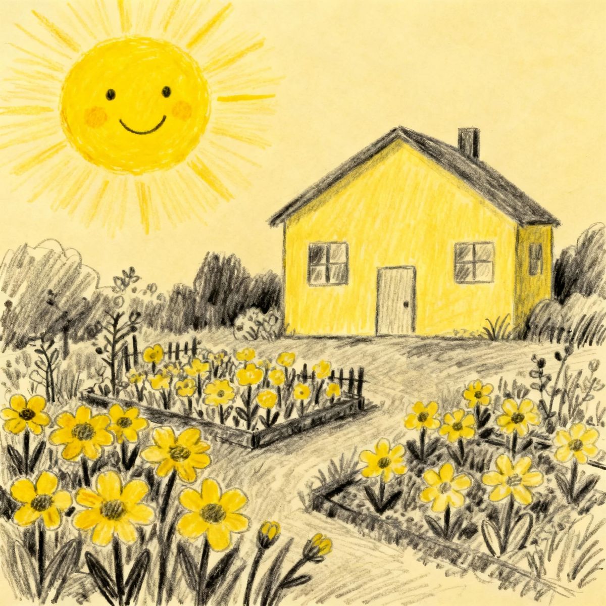 This image displays a charming yellow garden scene with a smiling sun, rendered in the style of a child's naive art drawing on yellowish paper.