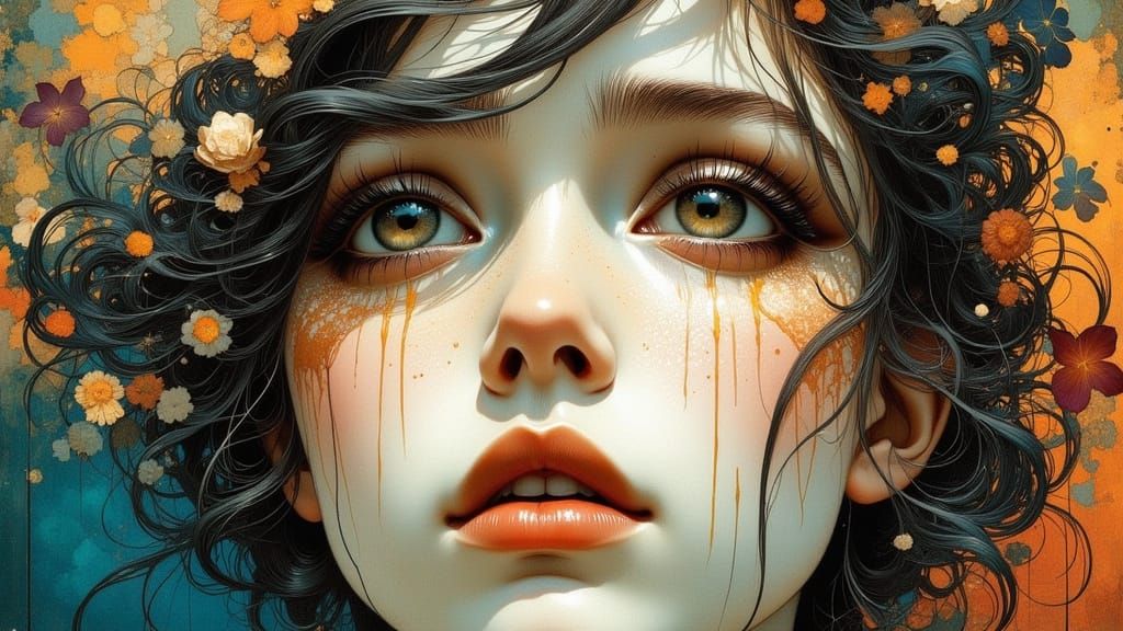 A captivating, hyperrealistic portrait of an angel, set against a dynamic, colorful background that shimmers and undulates, inviting the viewer to explore the depths of its sorrowful, intricately detailed face.