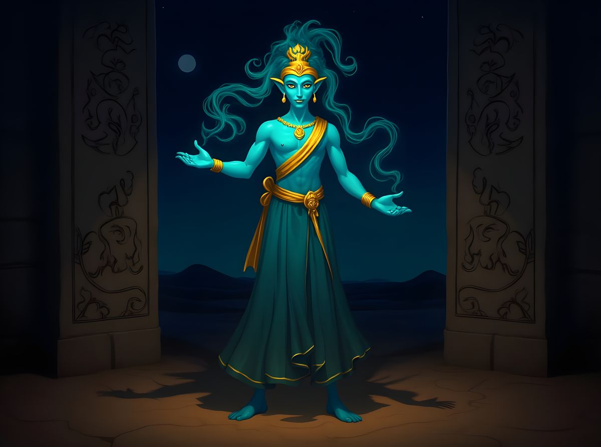 This image shows a wise, benevolent Jinn made of swirling sapphire and gold smoke, glowing softly. It's in a mystical art style with desert twilight and ancient Arabic script.