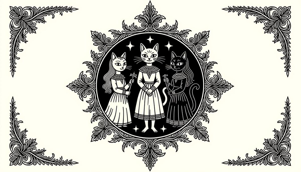 This image depicts a medieval sigil design featuring filigree and white oak elements. The black and white rendering includes stylized cat-girl figures integrated into the ornate details.