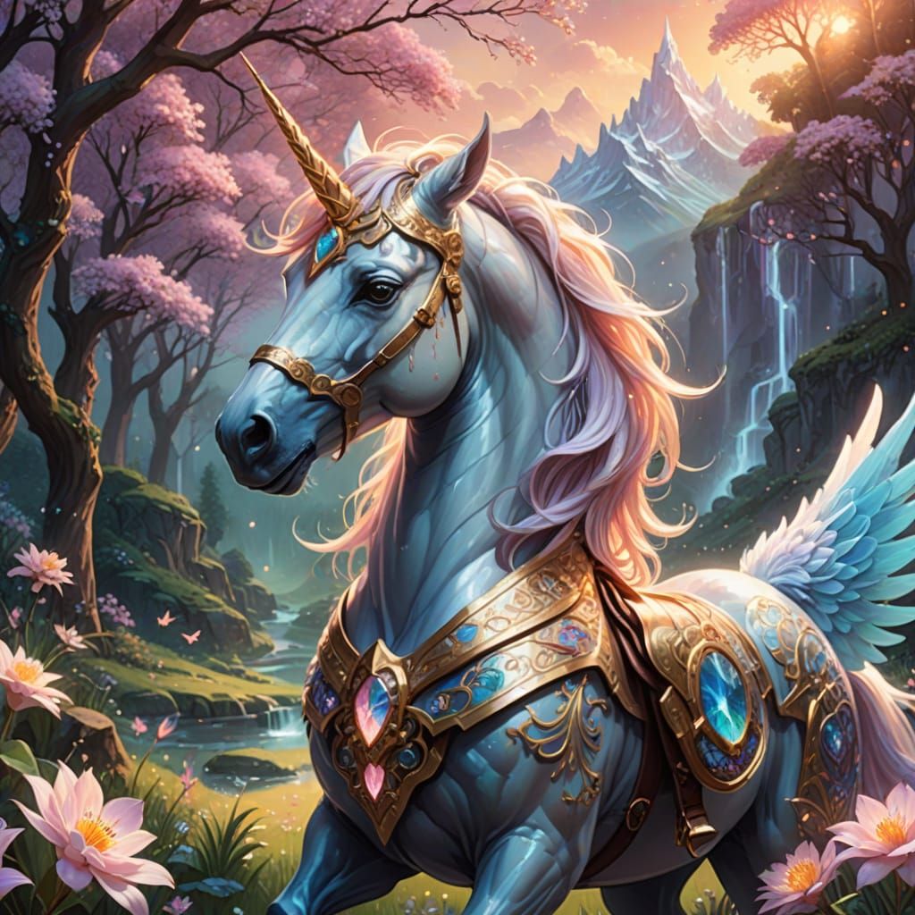 A striking picture of a majestic alicorn in crystal armor traversing an enchanted valley. The image features vibrant pastel colors, glowing elements, and a soft, warm lighting, creating an ethereal atmosphere.