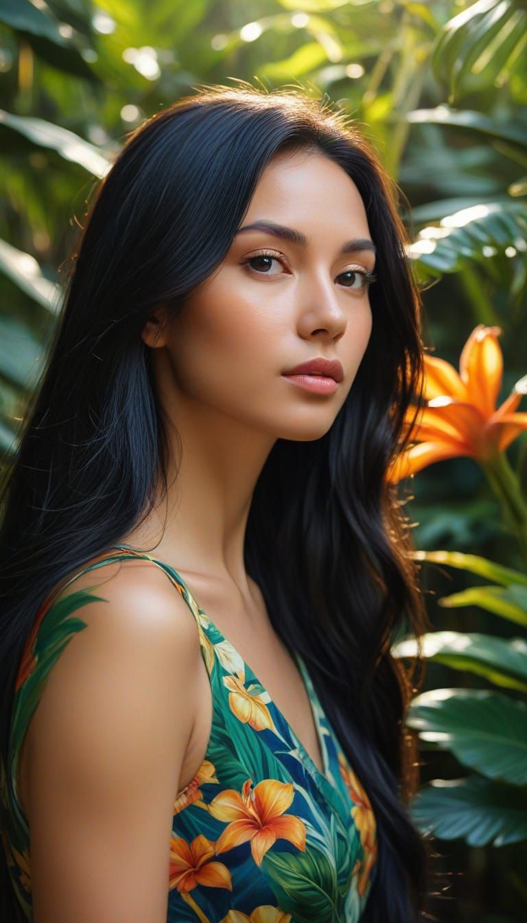 A vibrant oil painting of a woman with long black hair, set amidst a lush tropical environment with exotic flowers, captured in soft focus with expressive brushstrokes and warm sunlight filtering through the leaves.