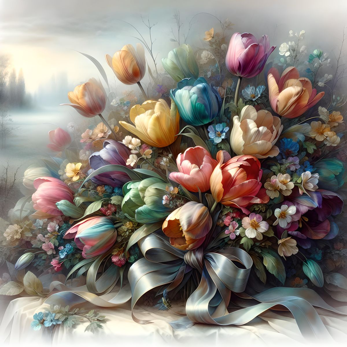 A striking picture of a colorful tulip bouquet tied with ribbon. The image evokes a sense of fantastical mystique reminiscent of pre-1912 art, rendered as a high-resolution watercolor.