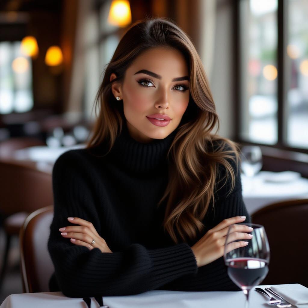 This image shows an ultra-feminine woman with straight hair in a soft, black mohair turtleneck sweater, seated in an elegant restaurant. Cinematic 3D art with detailed textures and vibrant color grading.