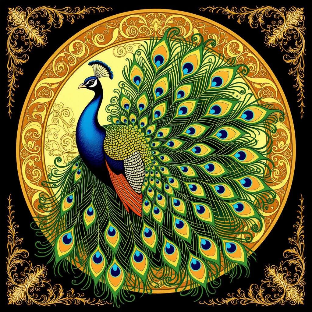 A stunning image of a peacock with Art Nouveau feathers against a gilded background. The artwork blends organic and geometric elements in a luxurious and opulent style.