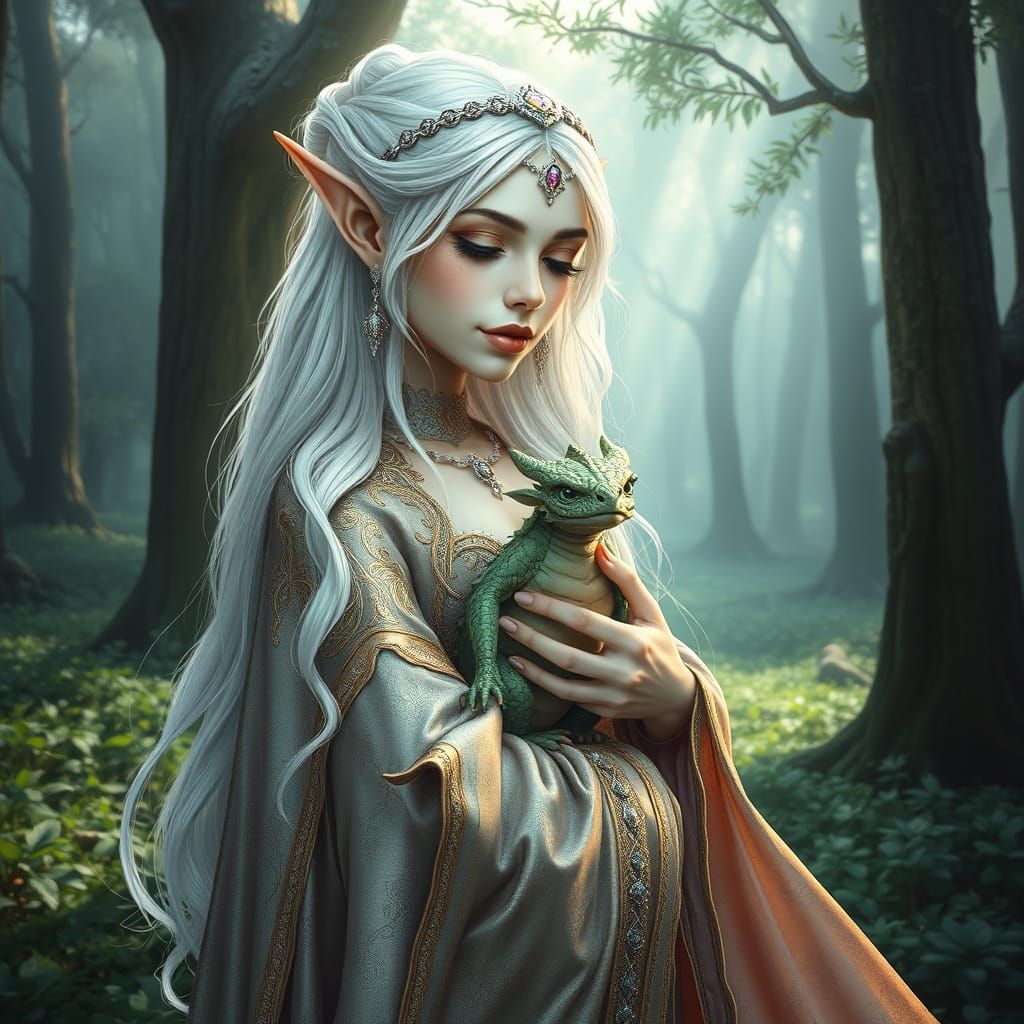 This enchanting image features a stunning elf woman with porcelain skin, adorned in a flowing gown and cloak, cradling a precious baby dragon in a tender embrace, surrounded by a lush, misty forest with towering trees and soft, emerald green foliage, evoking the whimsy of faerie art and the delicate brus...