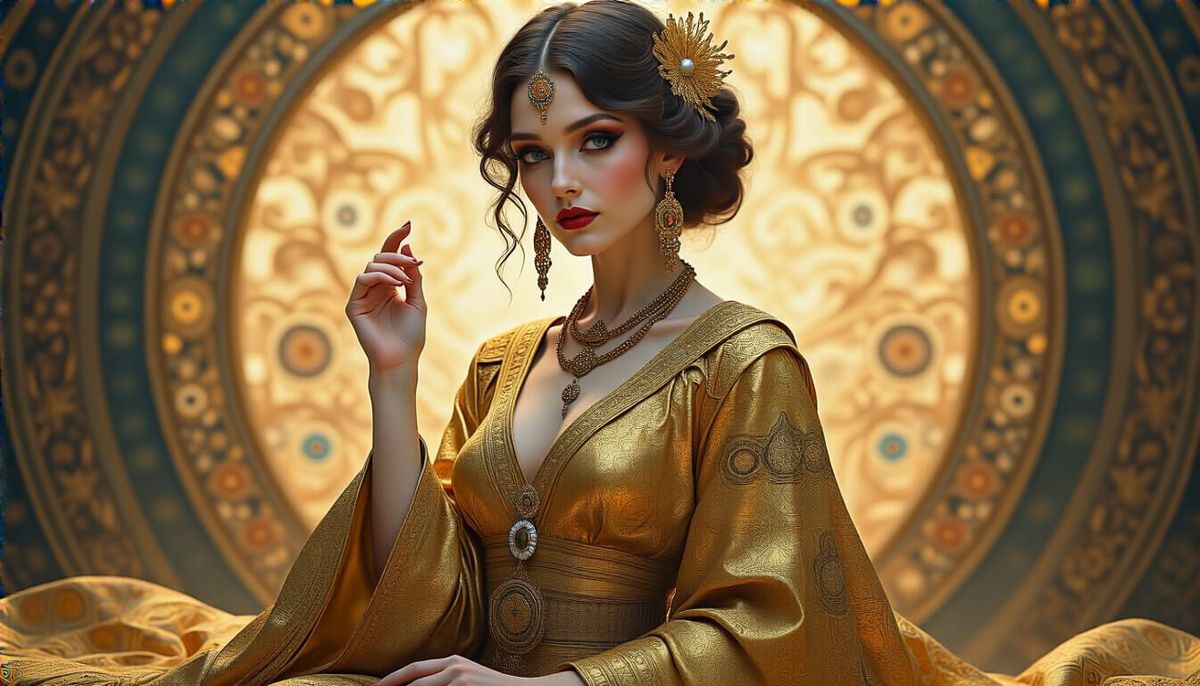 This image shows an elegant woman in golden attire, posing in a mystical atmosphere. The artwork is reminiscent of Gustav Klimt's style, with hyper-realistic textures and detailed accents.