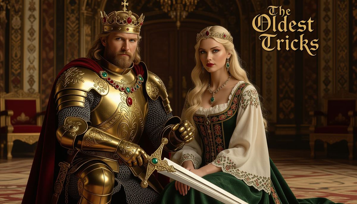 This image shows a medieval Swedish king in golden armor kneeling before a blonde Nordic woman in embroidered attire. The scene is set in a grand baroque ballroom with Art Deco script, rendered with dark shading and muted earth tones as digital art.