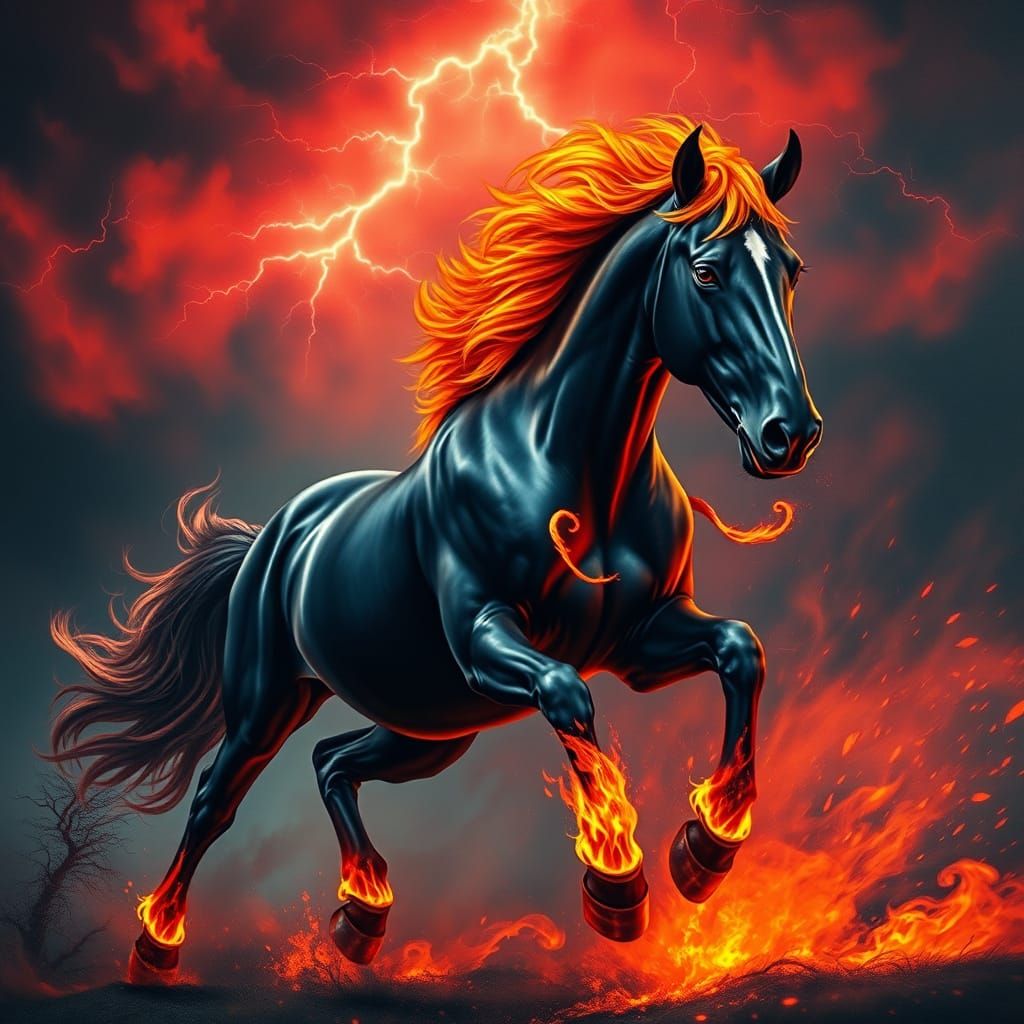 This captivating image depicts a majestic horse galloping through a stormy, fiery landscape, its glossy black coat contrasting with a mane and tail of flames. The background features a haunting red sky with ominous lightning, reflecting a sense of mystique and intrigue.