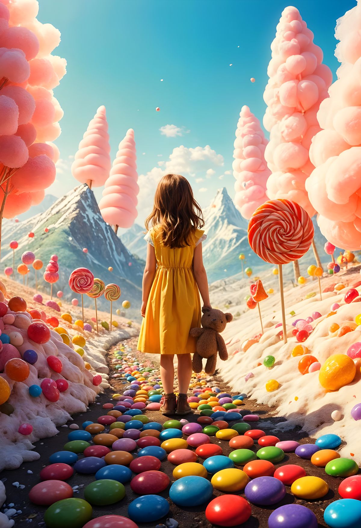 A rear view of a young girl with her teddy bear on a candy path. The path winds through a whimsical landscape of lollipops, marshmallows, and cotton candy in pastel colors, reminiscent of Beatrix Potter.
