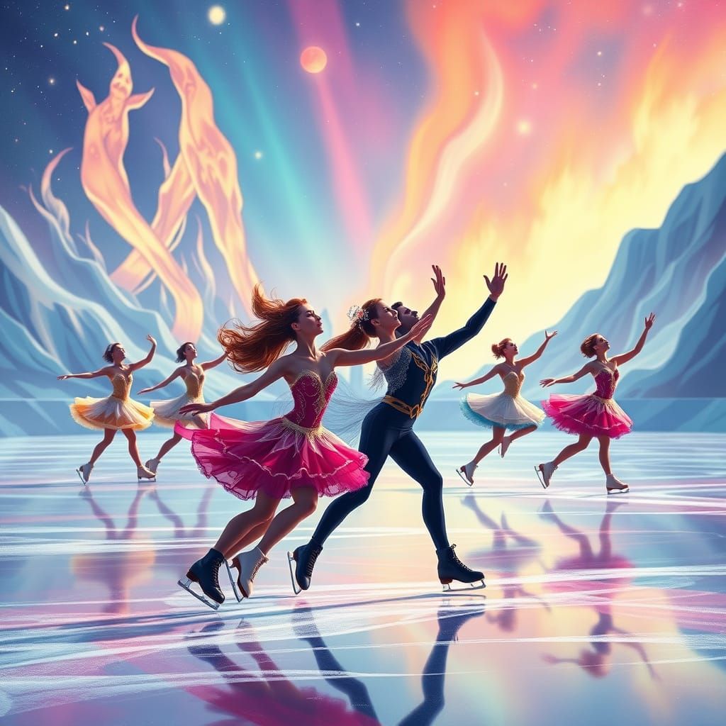 This image depicts figure skaters performing intricate synchronized movements on ice, with elaborate costumes and precise choreography, set against a backdrop of dynamic lighting and vivid colors, evoking a futuristic atmosphere reminiscent of sci-fi landscapes and whimsical illustrations.