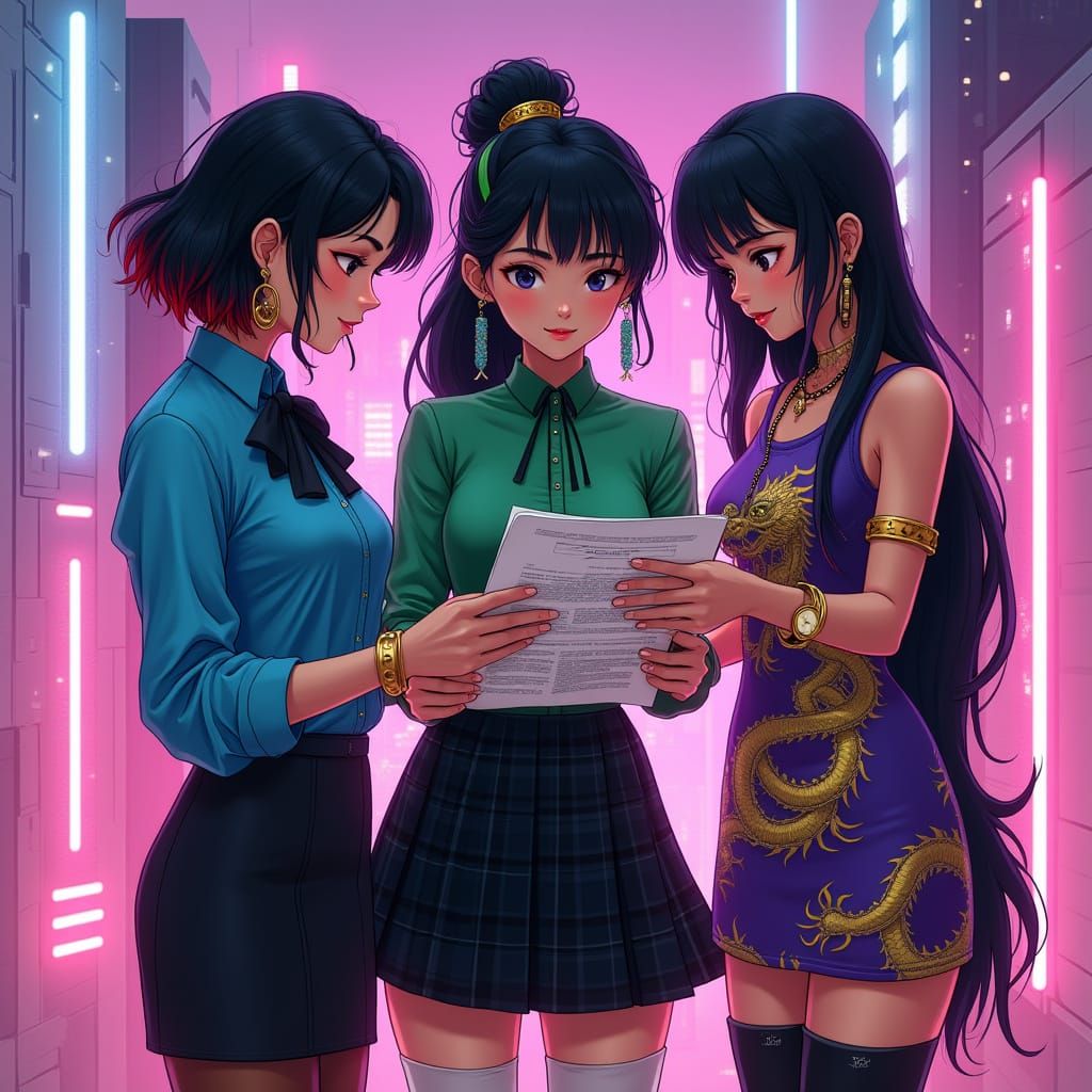 Three diverse friends, a Korean author, Japanese chemist, and Indian writer, study house plans under dramatic volumetric lighting. Features a synthwave neon retro aesthetic with vibrant magenta and cyan hues.