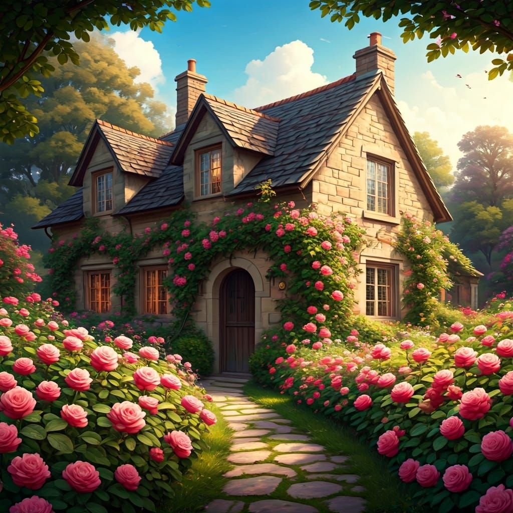 A picturesque country cottage with stone walls and roses, bathed in golden sunlight. This fantasy concept art style image features intricate details and deep, complementary colors in a matte painting.