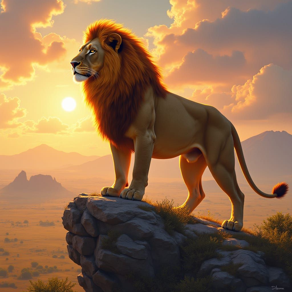 This image is a vibrant depiction of a lion standing proudly on a rocky cliff, surrounded by a sun-kissed savannah and distant mountains, rendered in a hyperrealistic style with rich colors and intricate textures.