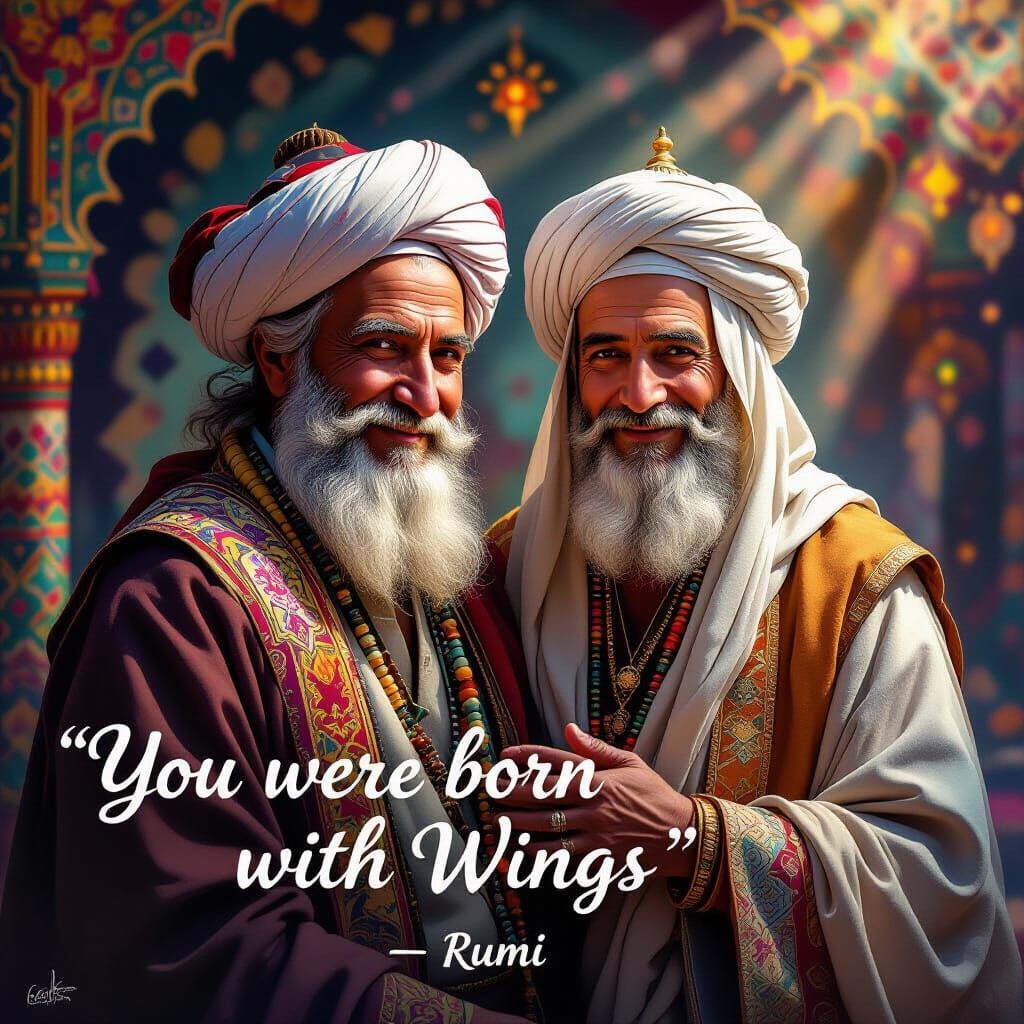 This image shows a Sufi mystic in traditional clothing smiling gently. Spiritual symbols adorn the colorful background. The composition is reminiscent of splash art.
