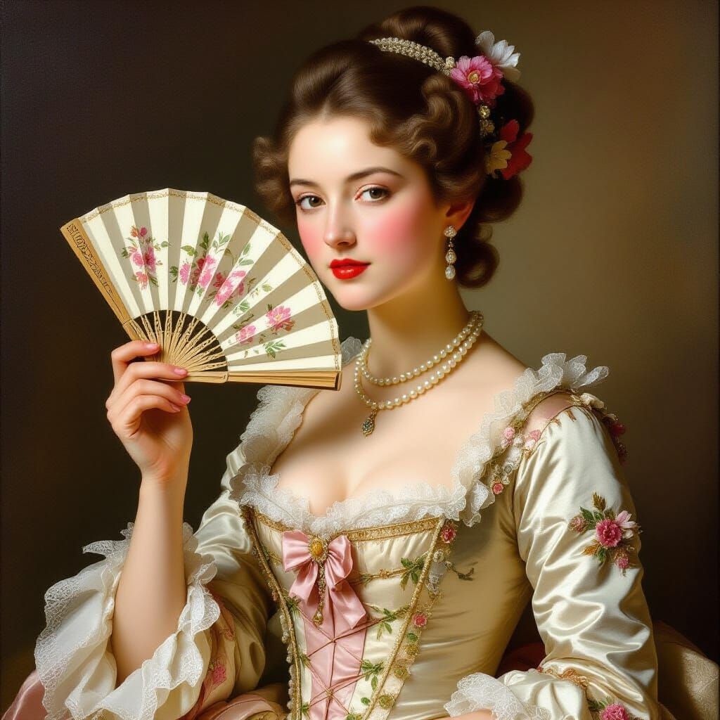This image shows a woman in an elaborate 1750s gown holding a fan. The portrait features realistic textures and soft, natural lighting, reminiscent of 18th-century portraiture.