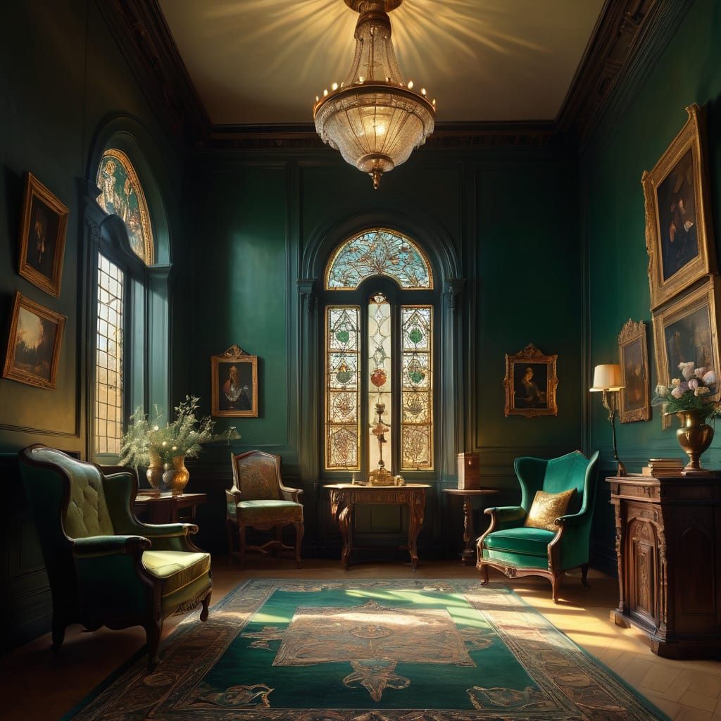 This image shows a luxurious vintage study with rich wooden furniture, bathed in warm sunlight from a stained glass window. Rendered in an oil painting style with Art Nouveau influences, it features an emerald armchair and Persian rug.