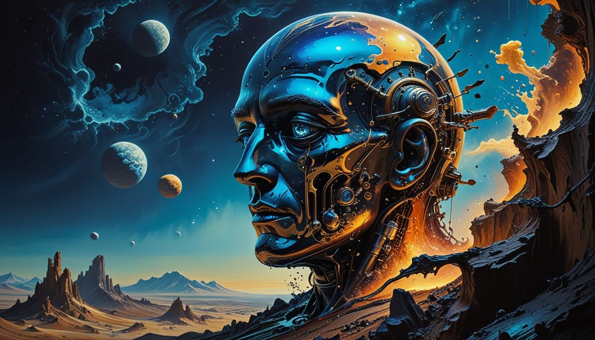 This breathtaking image shows a massive, futuristic city stretching vertically on a 180-degree axis, with towering structures piercing the sky and disappearing into the blue horizon. In the foreground, people gather around giant, Saturn-like planets and a natural moon, while a massive metal spaceship loo...