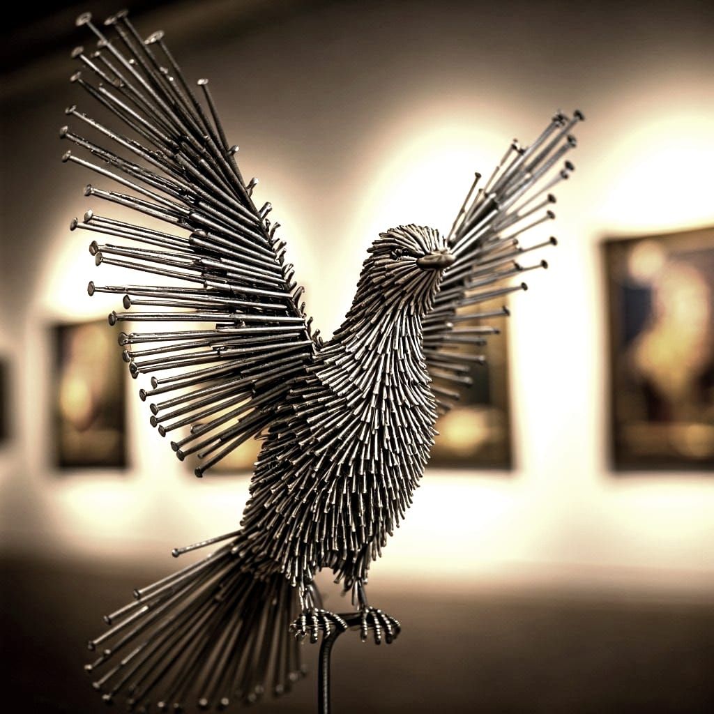 This image showcases an elegant Art Deco bird sculpture meticulously crafted from hundreds of thin steel nails, presented in a minimalist style against a soft bokeh background.