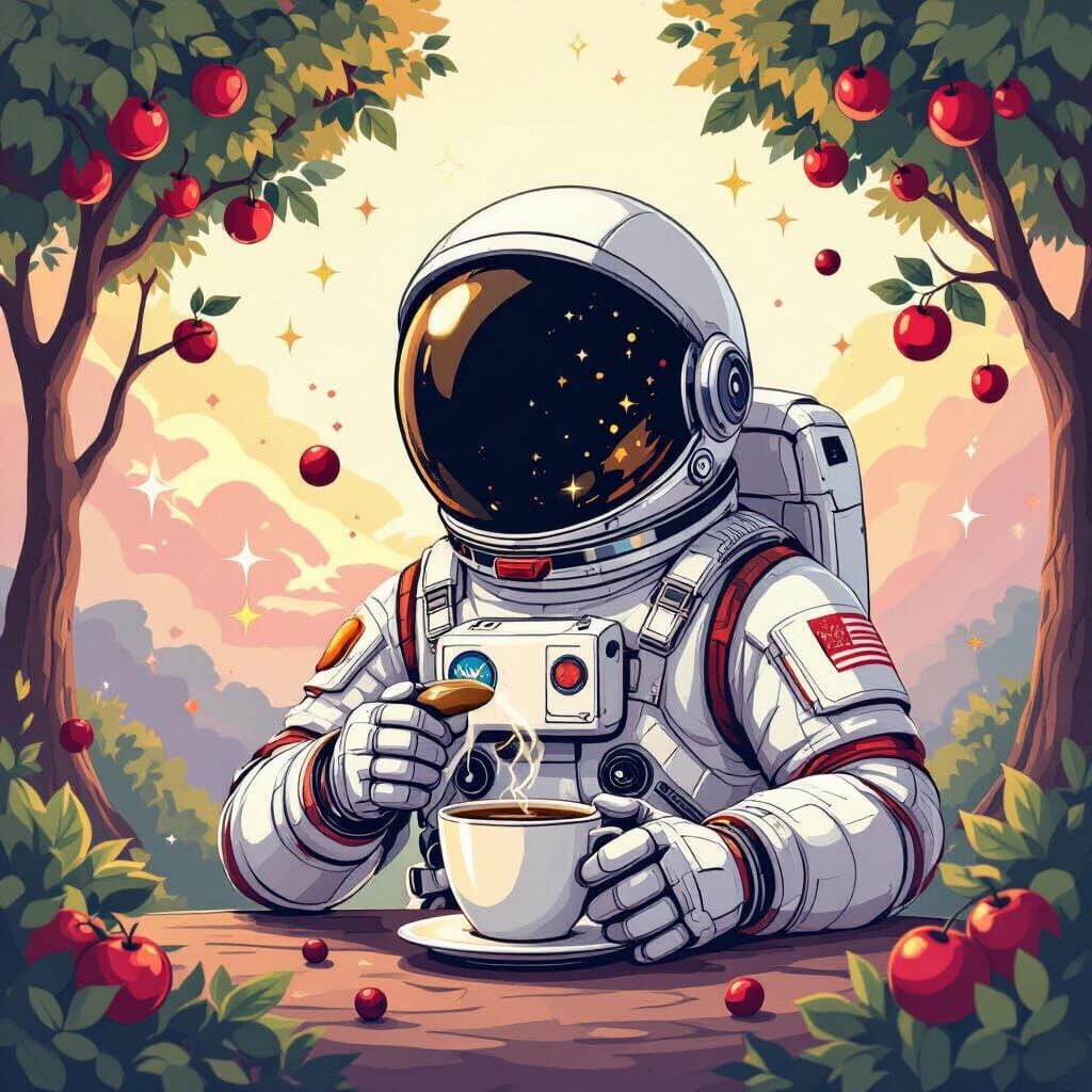 This digital art shows an astronaut preparing coffee with magical floating beans. Cartoon trees with coffee cherries are in the background, set against vibrant cosmic nebulae.