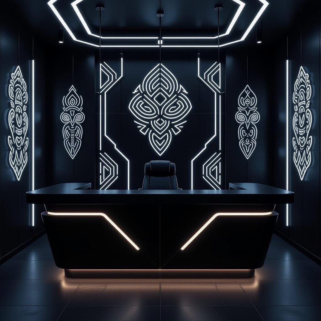 A sleek, minimalist tattoo parlor reception desk crafted from metal and dark wood. Behind it, a wall features glowing neon patterns and tribal symbols in a monochromatic concept art style.