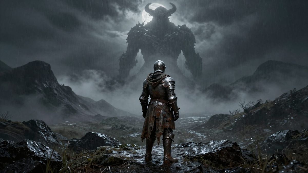 This image depicts a lone knight in rusted armor against a misty, mountainous Gothic landscape. A colossal stone golem emerges from the peaks under a stormy sky, rendered with dramatic lighting and a muted, eerie color palette.