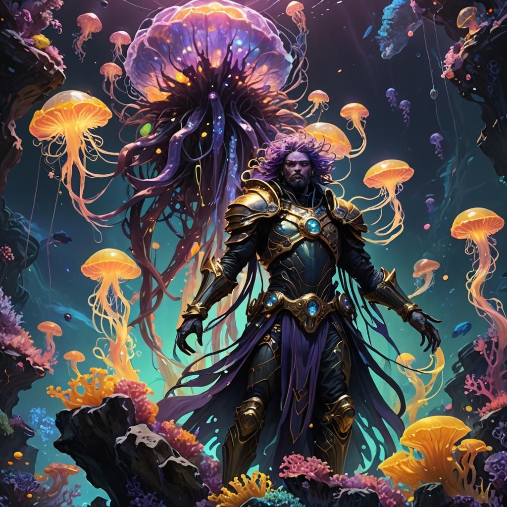 A dramatic image of a reef guardian. The figure stands on coral amid glowing jellyfish, with bioluminescent tendrils and iridescent reflections, in a misty dark fantasy aesthetic.
