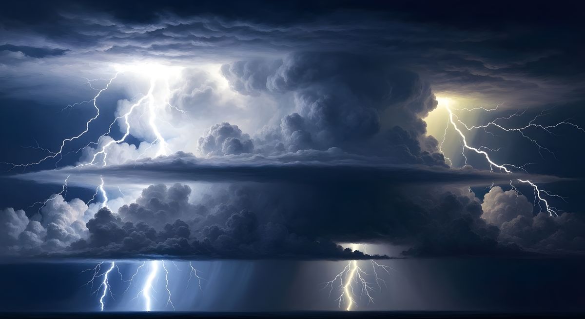 This image shows a panoramic view of a massive, multi-layered storm cloud formation illuminated by lightning. It is rendered in a detailed, textured neo-impressionist style with deep, ominous colors and dramatic light rays.